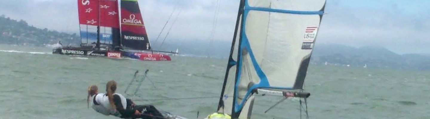Yesterday (Sunday) we sailed all the way upwind from Richmond to Alcatraz. We worked hard on boatspeed the whole way and were rewarded by ending up on the edge of the Louis Vuitton racecourse for the day’s race between Emirates Team New Zealand and Luna Rossa. We thought we were fast but our jaws dropped when the Emirates AC72 flew right by us as we sailed between Alcatraz and Angel Island. For our sail back home it was about 25 knots with puffs nearing 30 – just glad it was flooding!